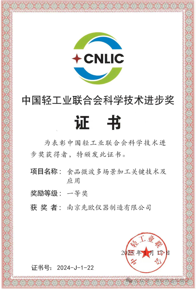 南京先歐儀器制造有限公司憑借其自主研發(fā)的食品微波多場景加工關(guān)鍵技術(shù)及應(yīng)用項目,成功斬獲中國輕工業(yè)聯(lián)合會科學(xué)技術(shù)進步獎 [一等獎]。這一殊榮是對南京先歐儀器在科學(xué)儀器領(lǐng)域持續(xù)創(chuàng)新、技術(shù)攻堅成果的權(quán)威肯定,標(biāo)志著公司在推動輕工行業(yè)技術(shù)進步方面邁出了堅實一步。